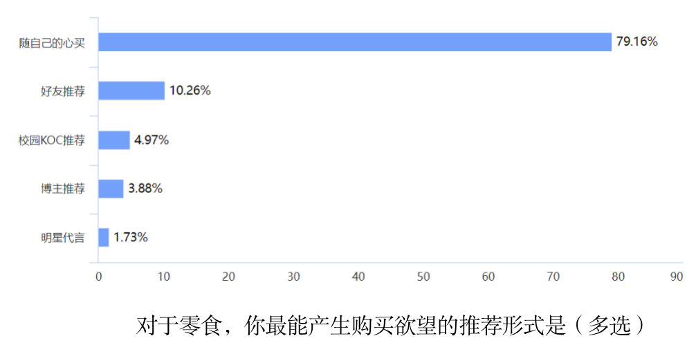 对于零食饮料,大学生更喜欢「随心买」,熟悉的社交圈层的人种草效果更明显。「校内商超」是大学生最常购买零食饮料的渠道,「俺来也」跃居最常购买的渠道NO.5。