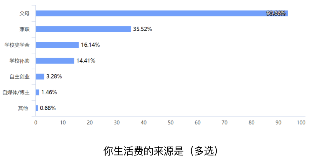 根据调研结果显示,40%的大学生每月生活费在1000-1500之间,绝大部分大学生的生活费来源于父母,生活费主要用于满足生活刚需的需求,恩格尔系数较高。